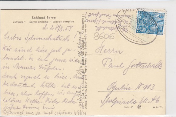Sohland an der Spree OT Wiese Bahnpoststempel 1955