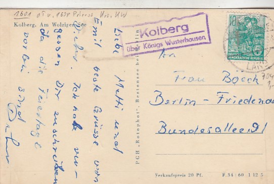 Kolberg bei Prieros Am Wolziger See mit Landpoststempel 1960
