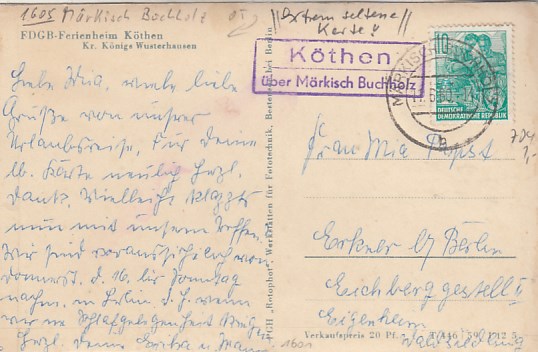 Märkisch Buchholz OT Köthen FDGB Heim Landpoststempel 1959