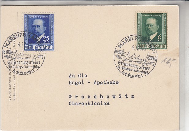Handwerk Berufe Emil von Behring Arzt Diphterie Tetanus Marburg Sonderstempel 1940 Apotheke