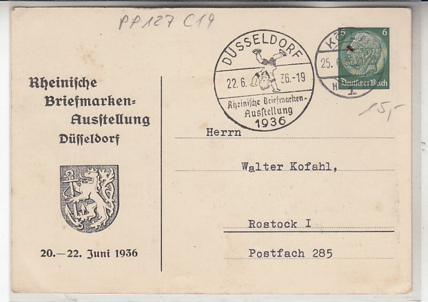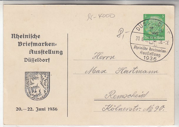 Privatganzsache Ulk Postamt Postbeamte Briefmarken-Ausstellung Düsseldorf Sonderstempel 1936
