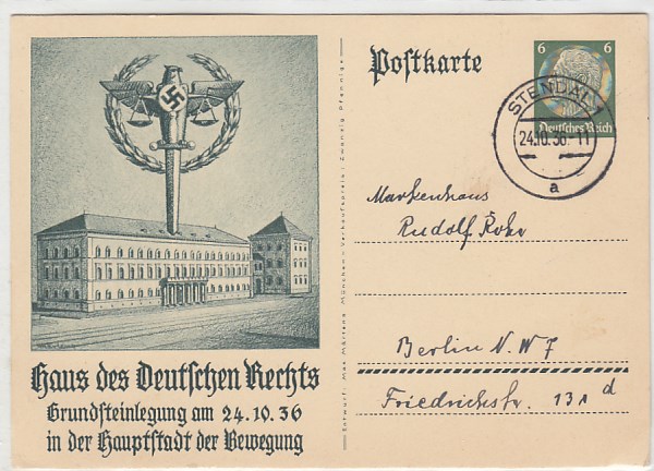 Privatganzsache Haus des Deutschen Rechts 1936 Stempel Stendal