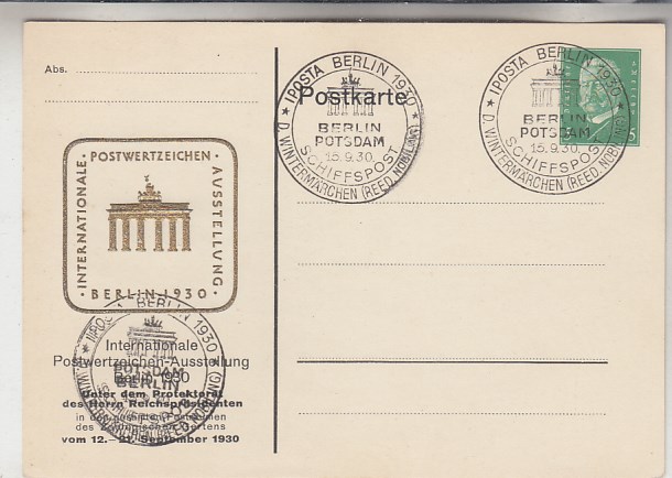 Privatganzsache Berlin Postwertzeichen-Ausstellung 1930 Sonderstempel Schiffspost Wintermärchen