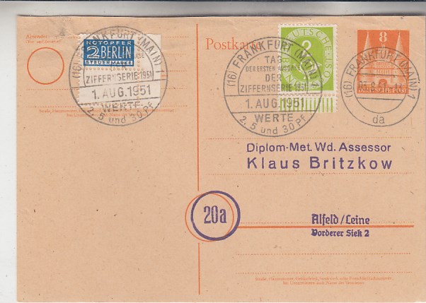 Privatganzsache Deutsche Bundespost 8 Pfennig Sonderstempel Frankfurt am Main 1951