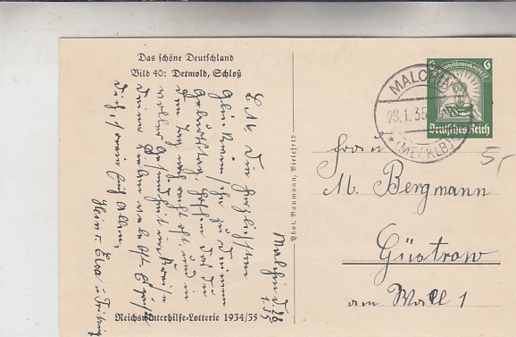 Privatganzsache Deutsches Reichswinterhilfe Lotterie 1934/35 Detmold Stempel Malchin