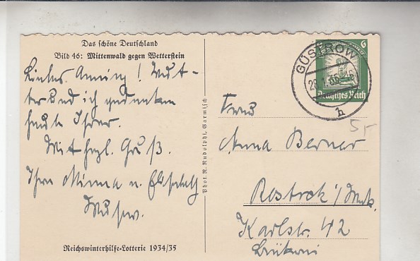 Privatganzsache Deutsches Reichswinterhilfe Lotterie 1934/35 Mittenwald Stempel Güstrow