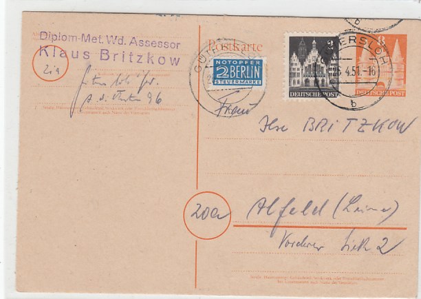 Privatganzsache Deutsche Bundespost 8 Pfennig Stempel Gütersloh 1951