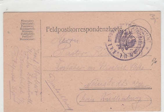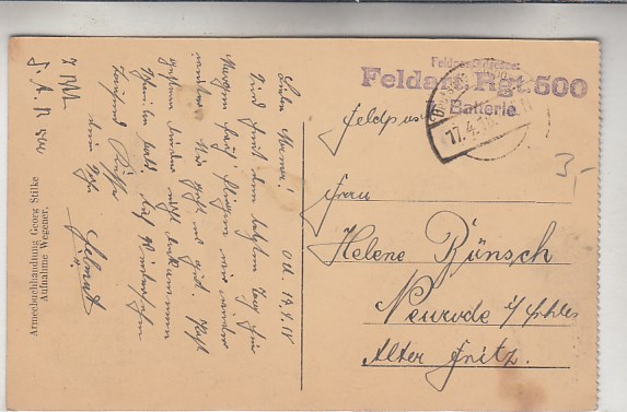 Feldpoststempel auf AK Regiment 500 Batterie 1.WK 1918