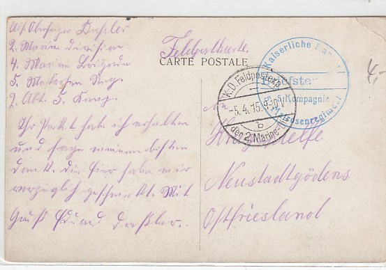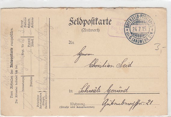 Feldpoststempel Bayern Landwehr Division 1.WK 1915