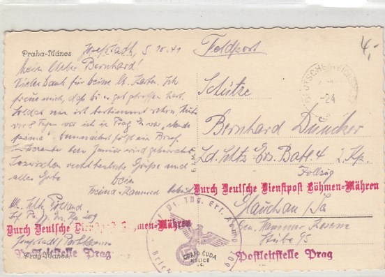 Feldpoststempel Duch Deutsche Dienstpost Böhmen-Mähren 2.WK 1941 auf AK Praha Manes