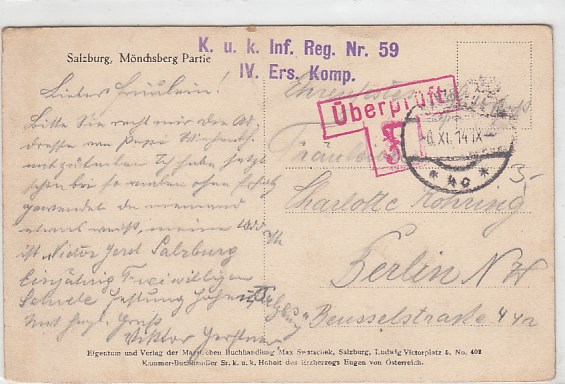 Feldpoststempel K.u.k. Infanterie Regiment Nr.59 auf AK Salzburg Österreich 1.WK 1914