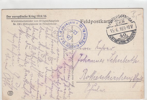 Feldpoststempel Infanterie-Division Nr.40 1.WK 1916 auf AK Osteuropa