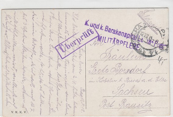Feldpoststempel K.u.k. Barakenspital Militärpflege auf AK Prag CSSR 1.WK 1915