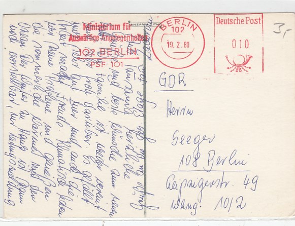 Sonderstempel Berlin Ministerium für Auswärtige Angelegenheiten Berlin Mitte 1980