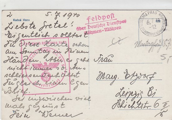 Feldpoststempel 2.WK Deutsche Dienstpost Böhmen-Mähren auf AK Kutna Hora 1940