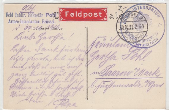 Feldpoststempel Armee Intendantur Belgien auf AK Waterloo 1.WK 1916