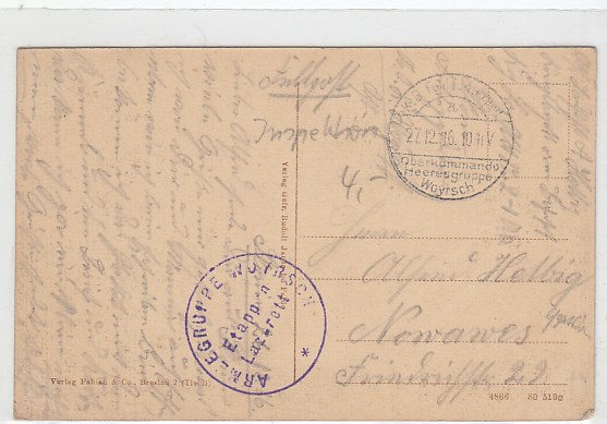 Feldpoststempel auf AK Woyrsch Inspektion 1.WK 1916