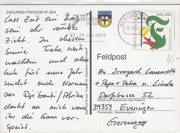 Sonderstempel auf AK Enduring Freedom AT Sea