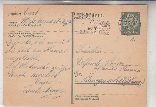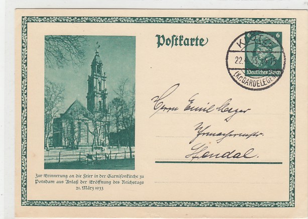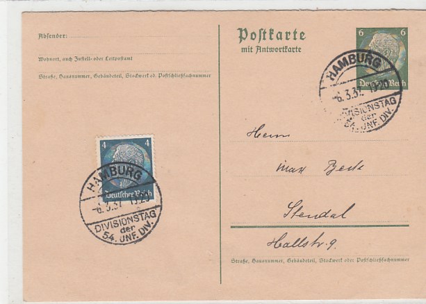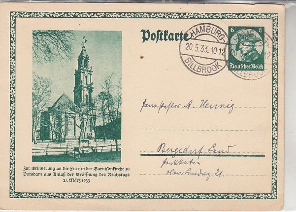 Potsdam Ganzsache 1933 Stempel Hamburg Billbrook