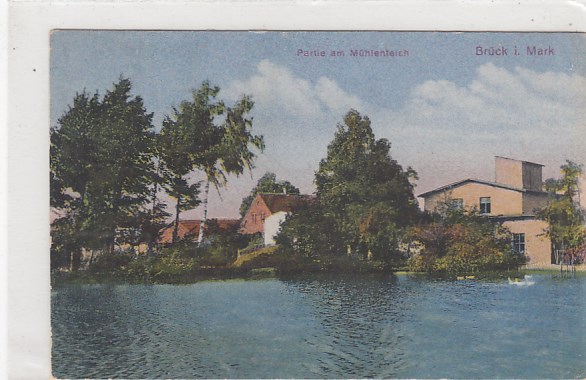 Brück in der Mark Mühlenteich Bahnpoststempel Berlin-Güsten 1930