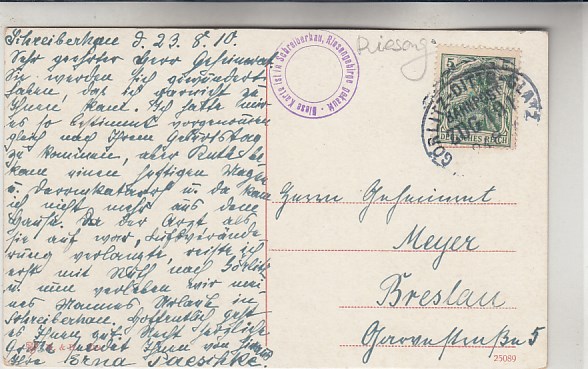 Mariental Schreiberhau Riesengebirge Bahnpoststempel Görlitz-Ditter-Glatz 1910
