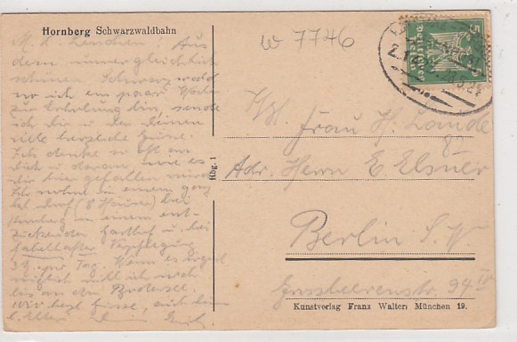 Hornberg Schwarzwaldbahn Bahnpoststempel 1924
