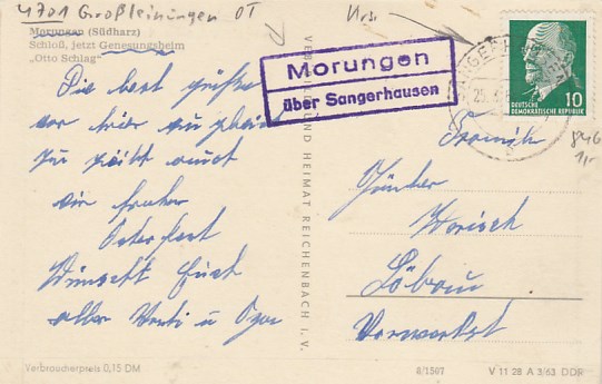 Großleinungen OT Morungen bei Sangerhausen Landpoststempel Schloß 1963