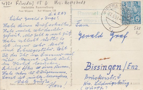 Rammelburg bei Wippra Harz in Sachsen-Anhalt Landpoststempel 1955