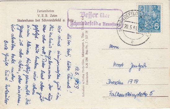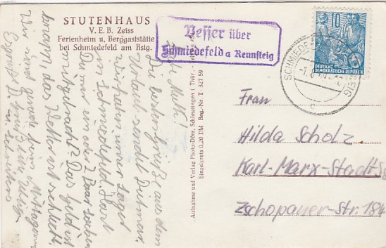 Vesser Stutenhaus bei Schmiedefeld am Rennsteig Landpoststempel 1959