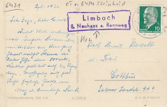 Limbach bei Neuhaus am Rennweg Thüringen mit Landpoststempel 1962