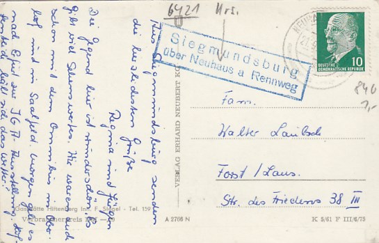 Neuhaus am Rennweg OT Siegmundsburg Thüringen mit Landpoststempel 1961