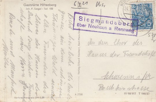 Neuhaus am Rennweg OT Siegmundsburg Thüringen mit Landpoststempel Gaststätte Hiftenberg 1957
