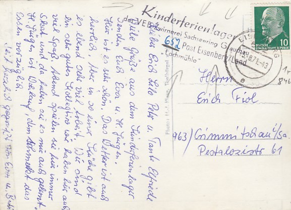 Lochmühle Mühltal bei Eisenberg in Thüringen Sonderstempel Kinderferienlager