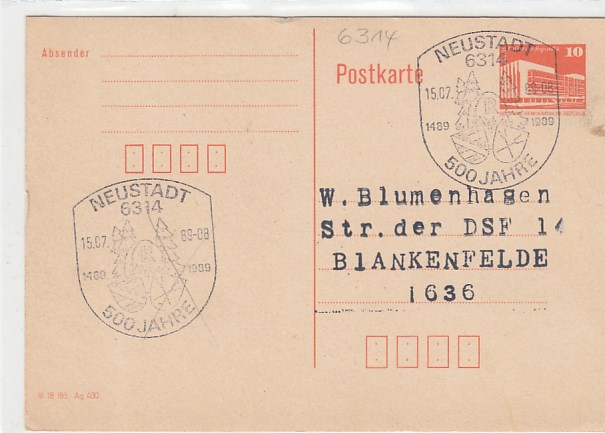 Neustadt am Rennsteig Thüringen Postkarte mit Sonderstempel 1989