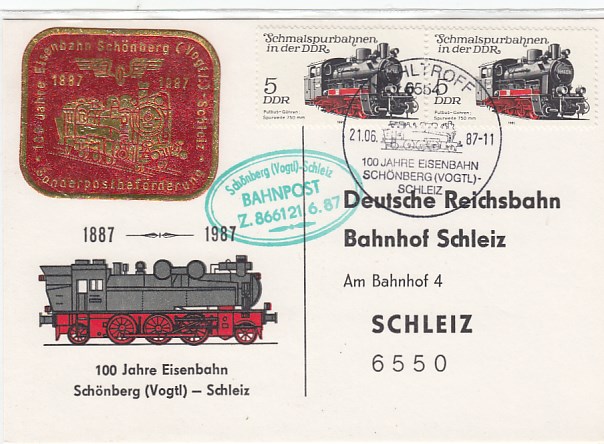 100 Jahre Eisenbahn Schönberg Vogtland Sonderstempel Mühltroff 1987