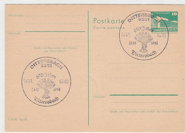 Dittersbach im Erzgebirge Postkarte mit Sonderstempel 1985