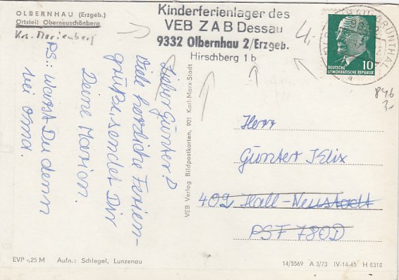 Olbernhau im Erzgebirge OT Oberneuschönberg 1973 Sonderstempel Kinderferienlager
