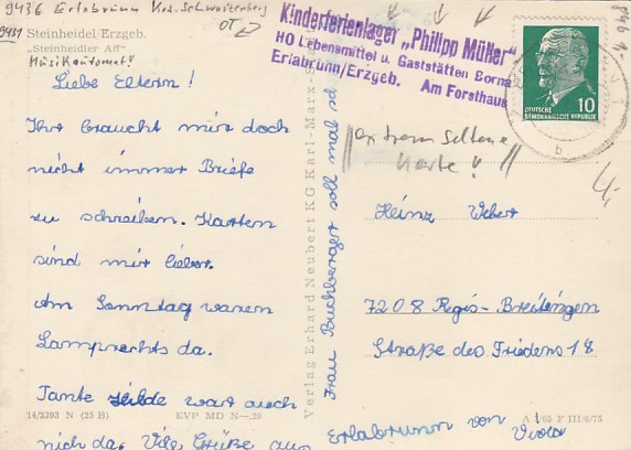 Erlabrunn OT Steinheidel im Erzgebirge Steinheider Aff mit Sonderstempel Kinderferienlager 1965