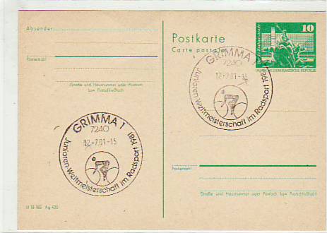 Forst in der Lausitz Postkarte mit Sonderstempel Fahrradrennen 1981