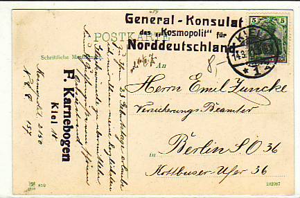 6790 [m73040] |  | Besonderheiten Sonderstempel Kosmopolit AK Kiel 1911 | 8.00EUR 6.00EUR | In den Warenkorb |