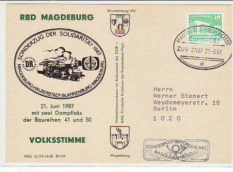 6729 [3000o1198] |  | Magdeburg Sonderstempel Belege Eisenbahn 1987 | 3.00EUR 1.50EUR | In den Warenkorb |