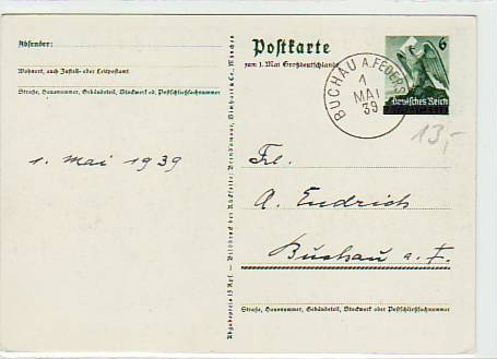 6898 [49736] |  | Propaganda 1939 Stempel Buchau | 14.00EUR 10.50EUR | In den Warenkorb |