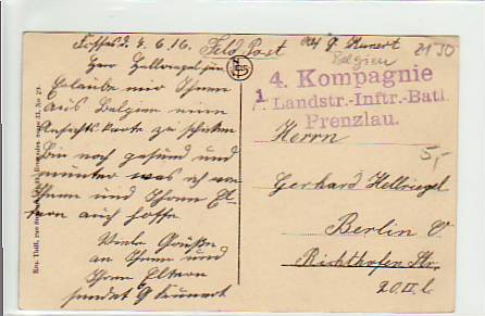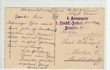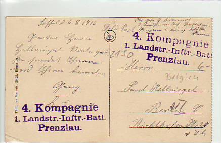 Prenzlau Feldpoststempel 4.Komagnie AK Botassart Belgien