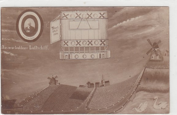 Zeppelin-Luftschiff Trier 1910 und Windmühlen Phantasie Foto Karte 1910