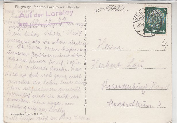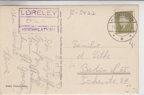 St.Goar am Rhein Hotel Restaurant auf dem Loreleyfelsen 1938