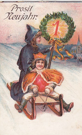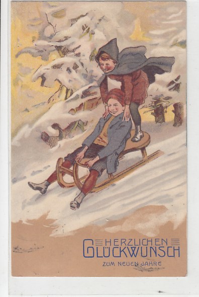 Glückwunsch AK Neujahr Ansichtskarte Winter Schlitten Kinder