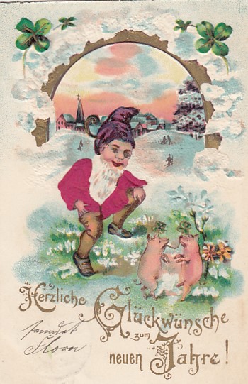 Glückwunsch AK Neujahr Ansichtskarte Zwerge Schweine Prägekarte