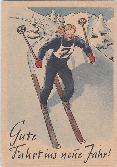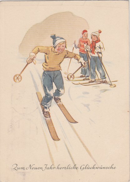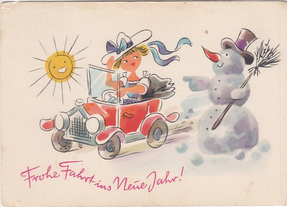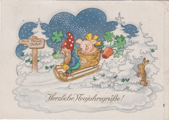 alte Glückwunsch Ansichtskarte zum Neujahr Schneemann Pilze Werbestempel Grüne Woche 1953