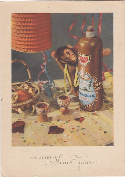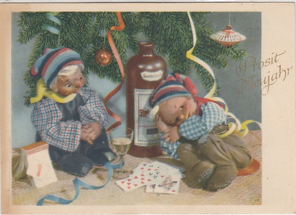 alte Glückwunsch Ansichtskarte zum Neujahr Schnaps Alkohol Puppen