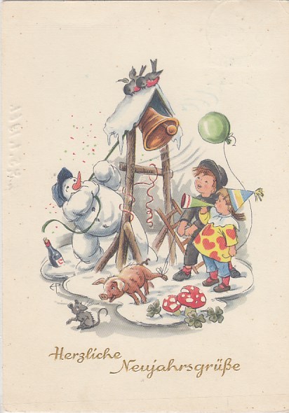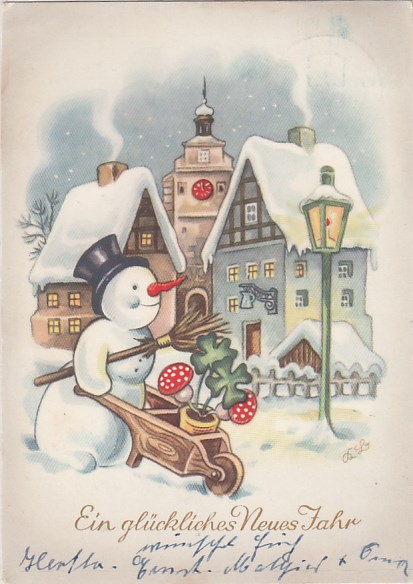 alte Glückwunsch Ansichtskarte zum Neujahr Schneemann Pilze
